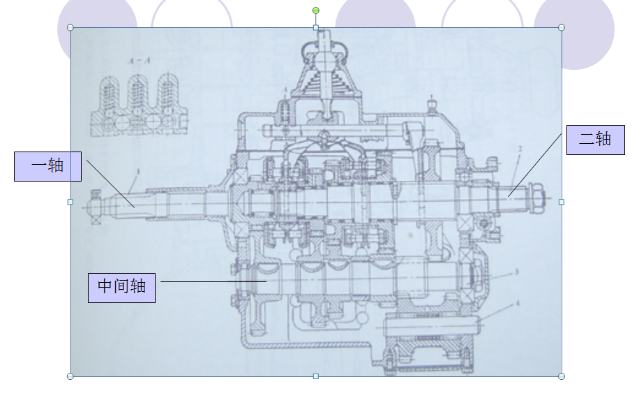 三軸變速器由輸入一軸、中間軸和輸出二軸組成,輸出一軸和輸出二軸同心,與中間軸平行,輸入一軸與中間軸有一組常嚙合尺寸。相比于二軸變速器,三軸變速器由于每個檔位傳動均有兩隊齒輪完成,顧傳動效率要低,直接檔則不通過中間軸直接輸出到輸出軸,并且在齒輪中心距較小的前提下依然可以獲得很大的傳動比。