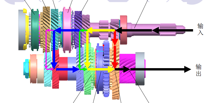 2軸式手動變速器中的一軸是動力輸入軸,和動力輸出的二軸平行,每個前進檔位均有一對齒輪嚙合進行動力傳動,相比于三軸變速器,二軸顯然是更緊湊,且結(jié)構(gòu)簡單,但是直接檔傳動效率沒有三軸的高。